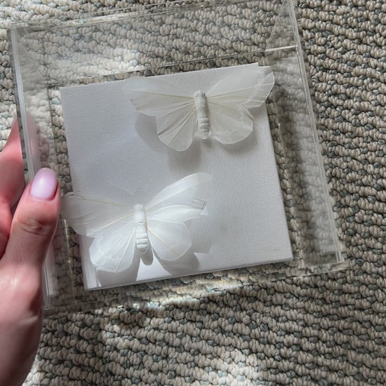 A 6x6 butterfly display from the Holiday Collection, encased in a polished acrylic frame. Each piece is a limited edition, made to order. Please allow 4–6 weeks for shipping.